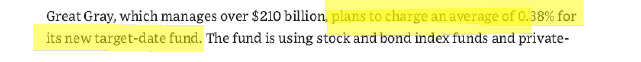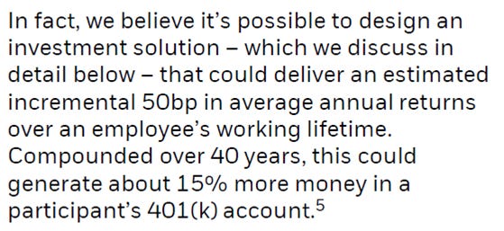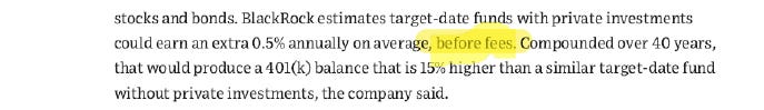 1. BlackRock says investing with Alts in TDFs could generate .5%, or 50 basis points (bp) per annum in incremental annual returns, or a 15% bigger nut at retirement. 50bp per annum is a nice round number; unfortunately for fee-paying Blackrock investors, it is a BEFORE FEE projection. An after-fee (fees are 38bp per the WSJ) projection that otherwise accepts BlackRock’s assumptions (we wouldn’t, but anyway) would be less than half that: 21bps per annum. This math gets us ~6% extra money at retirement rather than 15%.