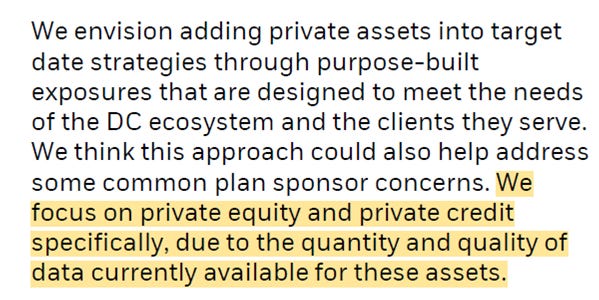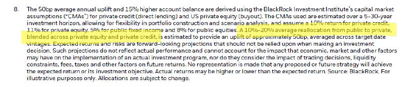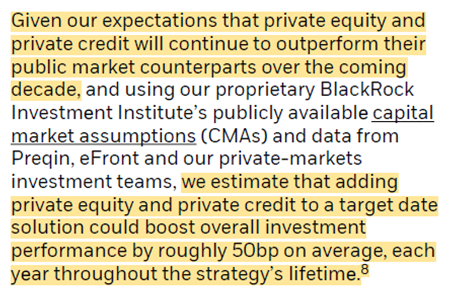 Think about it. This is not unlike taking the 2065 TDF vintage from a 95% public equity allocation to 100%. Aside: if you assume (reasonably, we think, and BlackRock’s assumptions do, too) that equities will return 3% better than bonds per annum and you added 5% to your equity allocation, you’d get 15 basis points of incremental return per annum (AND you’d stay liquid).