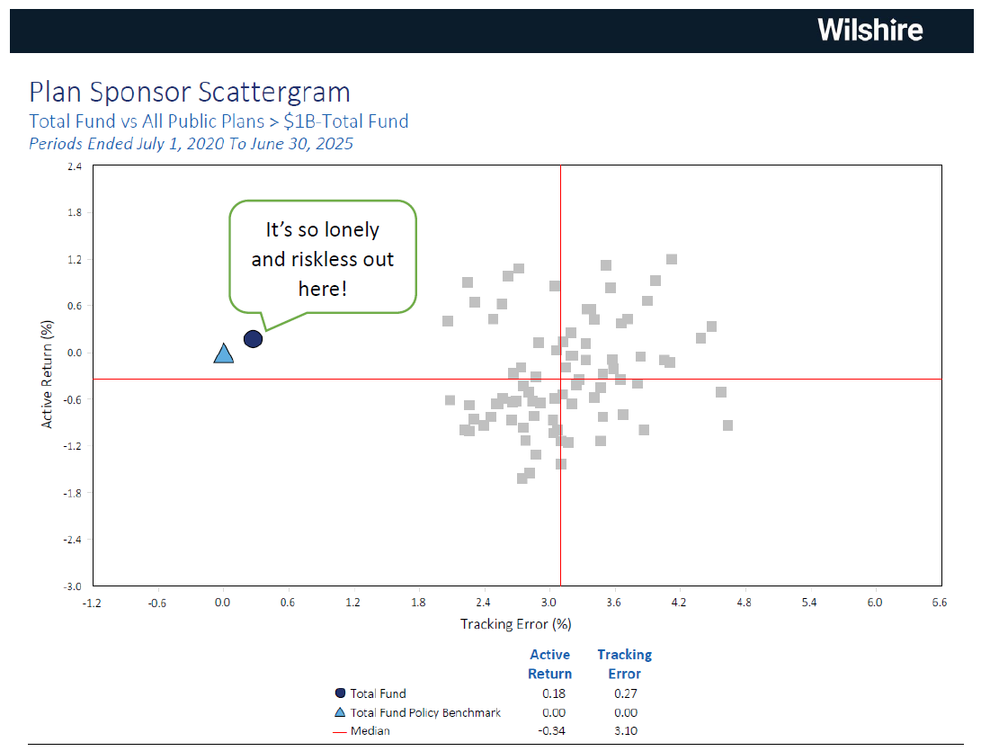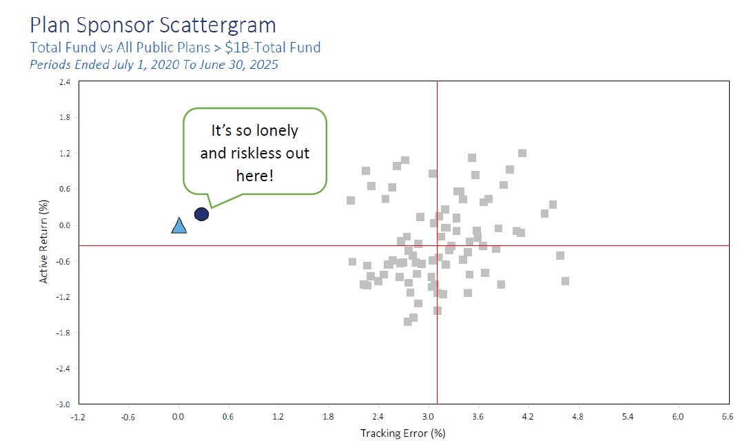 The scattergram suggests that IPERS is the only public plan in its peer group that measures it their (wrong) way. Wilshire’s (IPERS’ consultant) inclusion of IPERS’ policy benchmark (the blue triangle) on the below suggests that they, too, understand that IPERS likes to measure things, errr, differently.