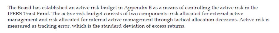 In IPERS world, one risk dimension gets much focus: tracking error. This is a measure of the degree of fluctuation of IPERS’ portfolio returns compared with the fluctuations of the benchmark returns.